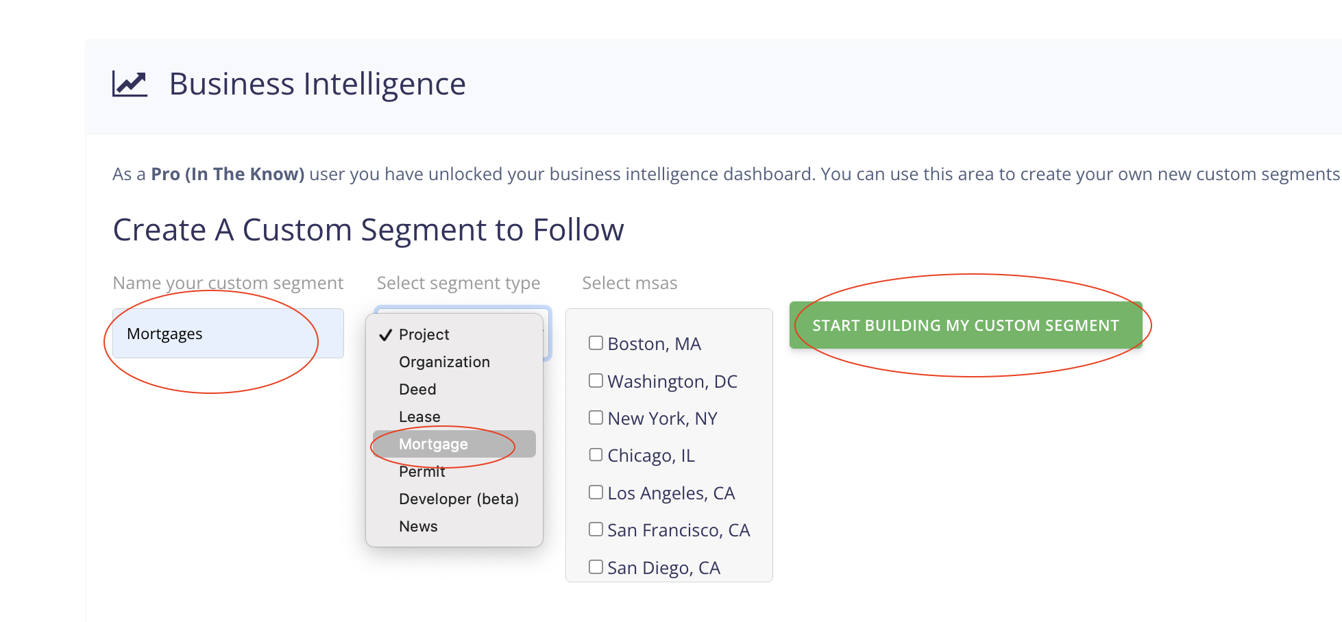 Click the biz intelligence tab at the top of the screen. Start creating a new custom segment. Make sure to name your segment to keep your alerts organized. Using the drop-down 'select segment type' click 'mortgages.' Click the MSA and start creating a custom segment.