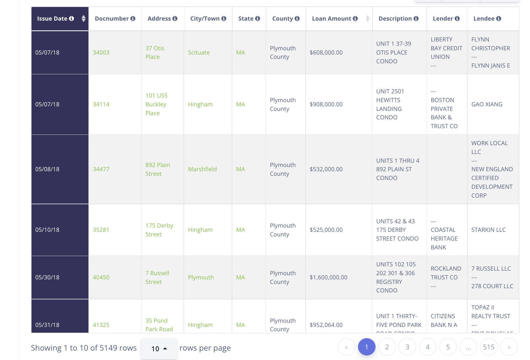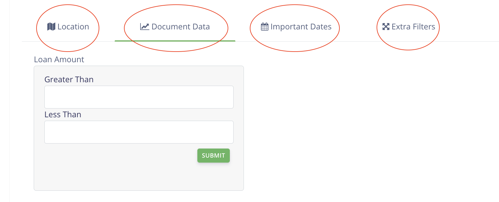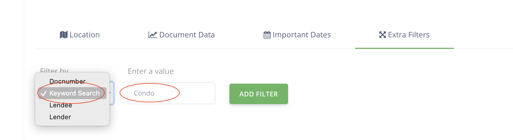 Create a search of mortgages using filters like a keyword search, dates, or location.